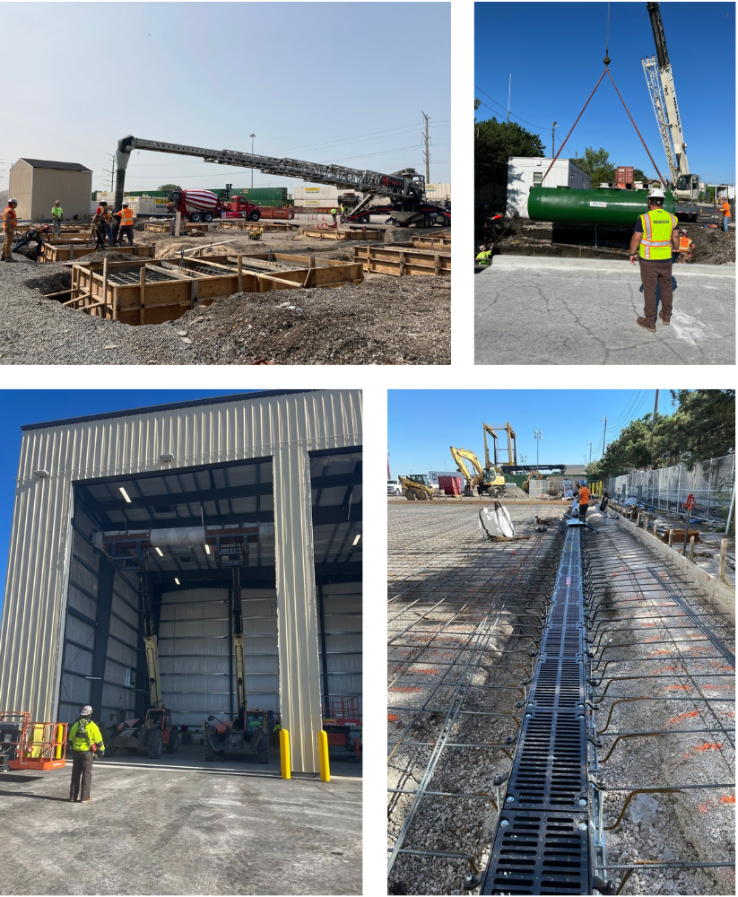 - Included: Installation of 25’ x 45’ concrete pad, all underground piping for oil and waste water, installation of underground sewer system including 300LF of new HDPE sewer, (6) new underground structures, (4) sediment basins, (1) 4’x8’ underground grit chamber with stainless steel bar screen, (2) above ground aluminum enclosures, (2) above ground 1000 gallon oil storage tanks, underground oil water separator tank (550 gallon tank at 63rd, 3500 gallon tank at Landers), all process piping, control wiring, and panels.