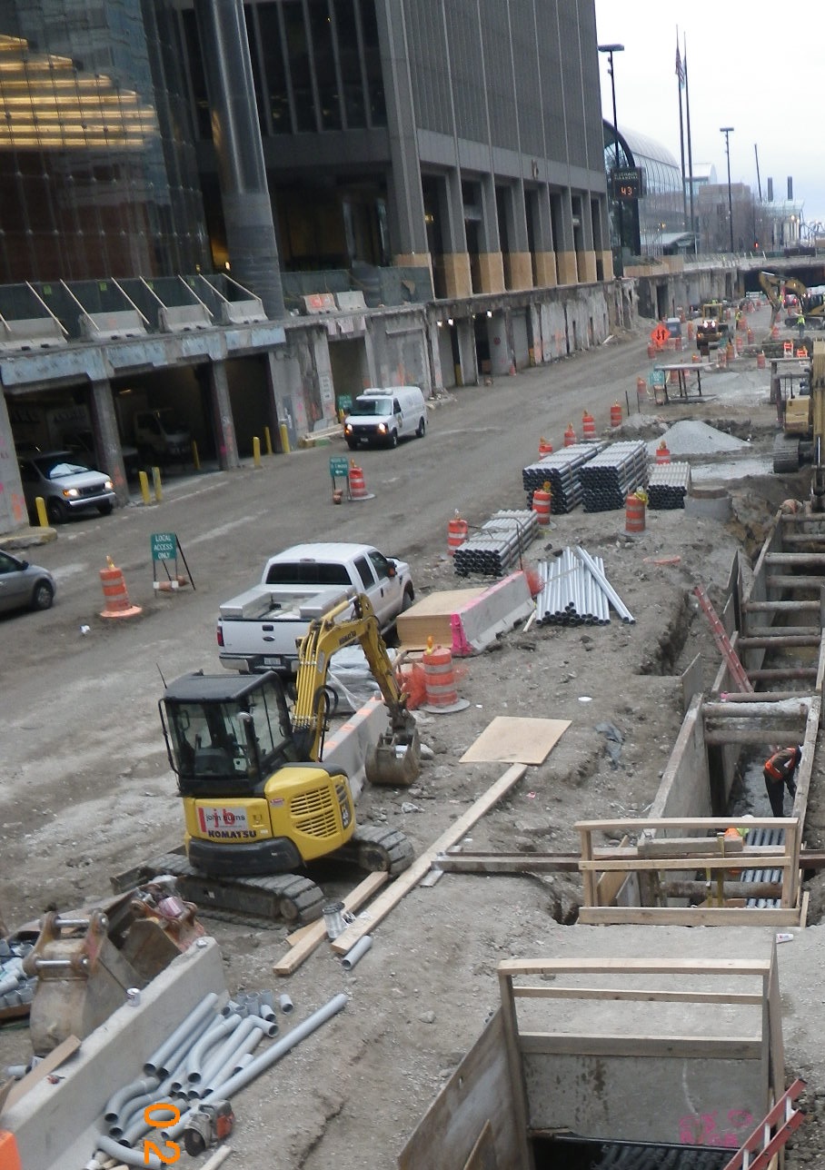 - Utilidor Construction: The Utilidor was the installation of a 32 cell concrete encased duct bank package running the entire length of the reconstructed Wacker Drive. The installation also included 6 cell concrete encased duct bank laterals running from the mainline near the utility entrances of various buildings. At some locations the utilidor was up to 20’ below the proposed Lower Wacker Drive Pavement. In addition to the duct bank packages JBCC was responsible for the installation of specially constructed precast manholes weighing approximately 30,000 lbs each. These larger manholes were used as tie in points for the laterals which terminated near the buildings at precast manhole weighing approximately 18,000 lbs each. JBCC was responsible for all shoring required making the excavation safe for the installation of the duct bank, and meeting the stringent requirements of OSHA. JBCC also had to be diligent in our digging techniques as to not hit the numerous utilities that were crossing all over Lower Wacker Drive. Due to all of these utilities JBCC had to utilize three different types of shoring methods during construction, and they were trench boxes, steel plates with hydraulic speed shores, and timber lagging.