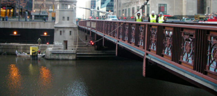 - Submarine Cable Installation: In order for the new bridge rooms to be able to be operable from one side, JBCC was required to install up to 6 submarine cables at one bridge location. Working with the coast guard and the city of Chicago, JBCC was able to install new submarine cables at Jackson, Adams, Washington, and Madison bridges. In order to complete this JBCC set up two 1A trucks at the east and west sides and essentially pulled the cable from one end to the other, then lowering the cable into the river. Using divers JBCC inspected the condition of the cable to ensure they were lying flat and not overlapping each other.